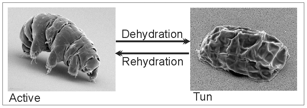 During their “tun” state, the metabolic activity of the tardigrades almost goes down up to 0.01%, coming very close to death. This state is also called as “cryptobiosis”. Their transformation into this cryptobiotic “tun” state starts when it loses 99% of its water. In favourable conditions, when exposed to water, the tardigrade slowly rehydrates, comes back into its original form and then proceeds to feed themselves in order to make up for the energy reserves that they lost in the process of cryptobiosis.